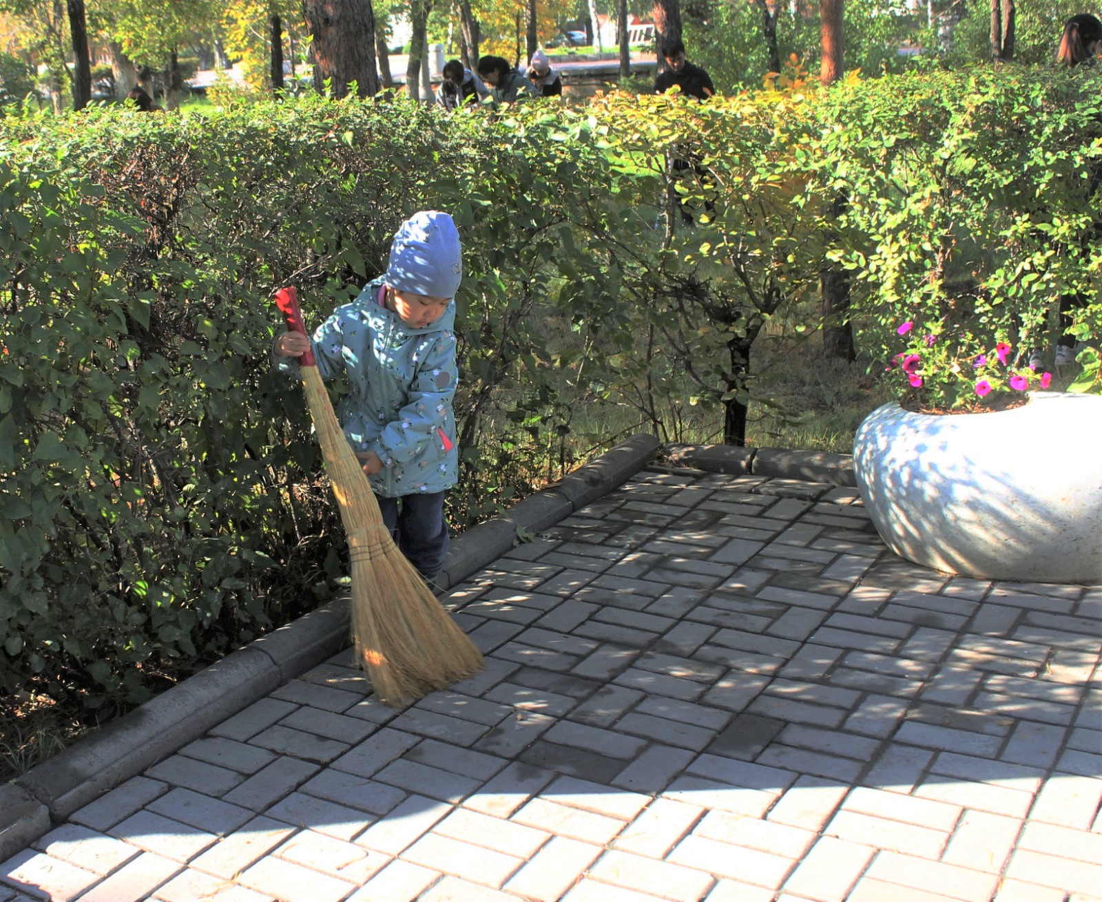 Әкімдік ғимараты алдындағы скверде еңбектеніп жатқан ересектер ішінен кішкентай балақайға көзіміз түсті. Қасындағы анасына қарағыштай пыс-пыс етіп қолындағы сыпырғышпен жапырақтарды сыпырып жүр. «Есімің кім?» – деп сұрап едік, «Айзере», – деді ұяң тіл қатып. Айзере сенбілікке анасы Әсемгүл Қонақбаеваға ілесе келіпті. Қала әкімі аппаратында бухгалтер болып қызмет істейтін Әсемгүл 40 шақты әріптесімен бірге еңбектеніп ғимарат маңайын тап-таза етуге өз үлесін қосуда екен.