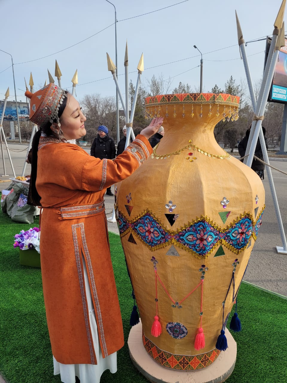Алаңдағы басты көркем элементтердің бірі – папье-маше әдісімен жасалған алып «қыш» құмыралар. Биіктігі 2,5 метр, 2 метр және 1,8 метр болатын үш құмыра 30 күн бойы дайындалған. Бұл ауқымды жұмыс Мәдина Қуатқызының жетекшілігімен жүзеге асып, педагогтардың бірлескен еңбегінің нәтижесіне айналды.