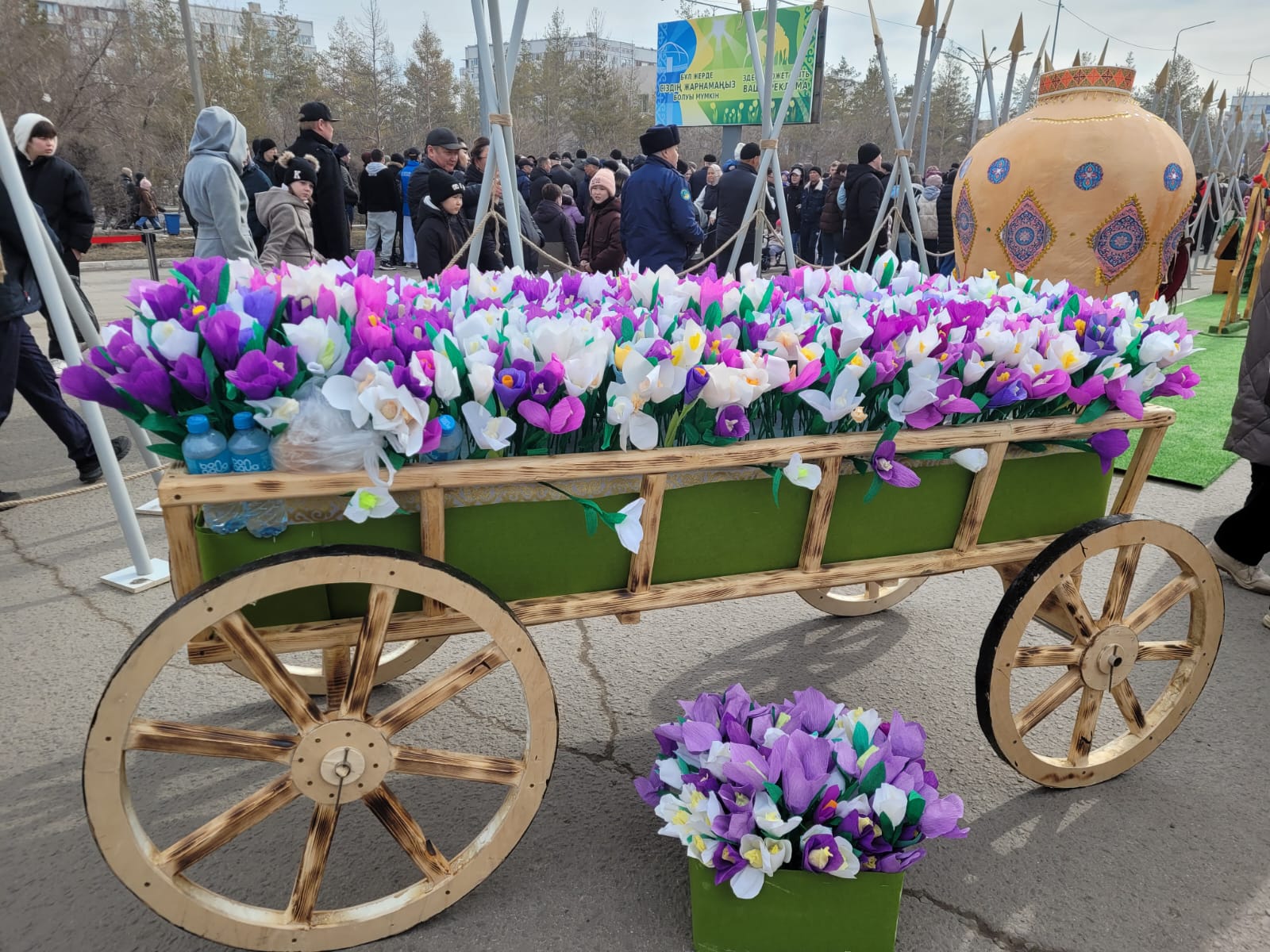 Кеңістікті көркейткен ерекше композициялардың қатарында екі сәндік арба да бар. Бұл арбаларды №17, №7 мектептер мен «Қайнар» кешенінің педагогтары дайындаған. Арбалардың іші толықтай гүлдермен безендіріліп, көктемнің көркін айшықтай түсті. Барлық гүлдер гофрленген қағаздан жасалып, қол еңбегінің нәзік үлгісін көрсетті.