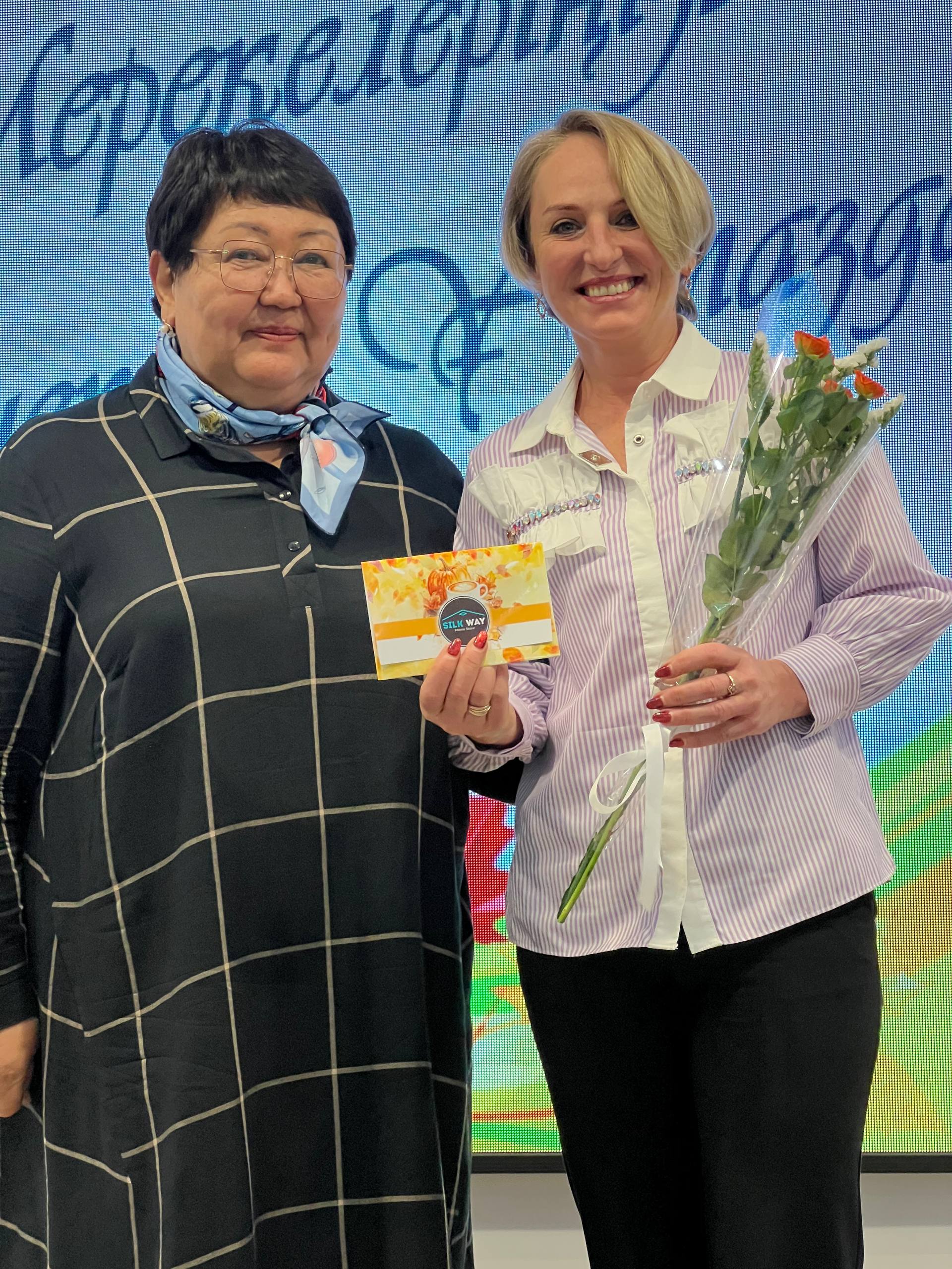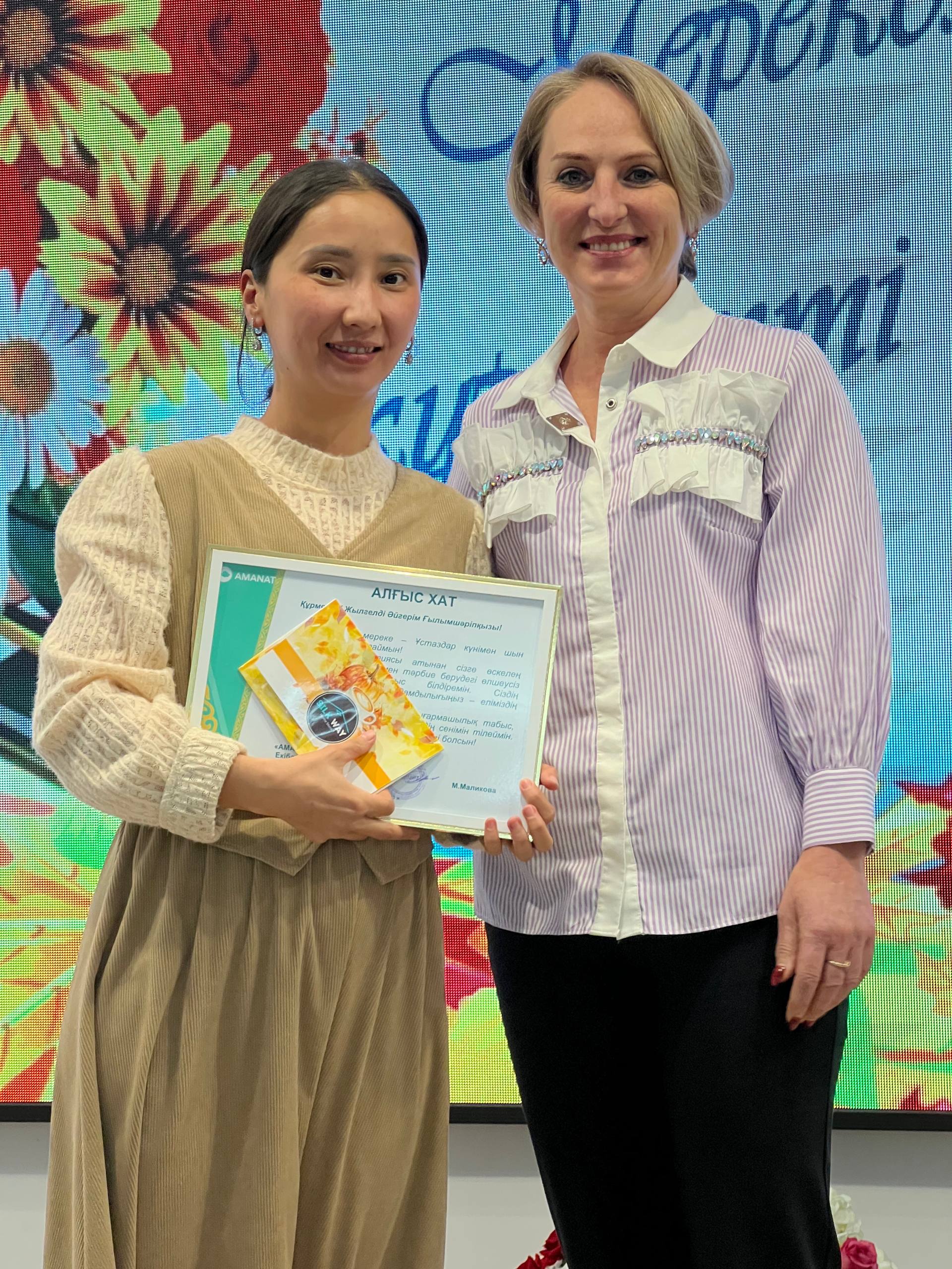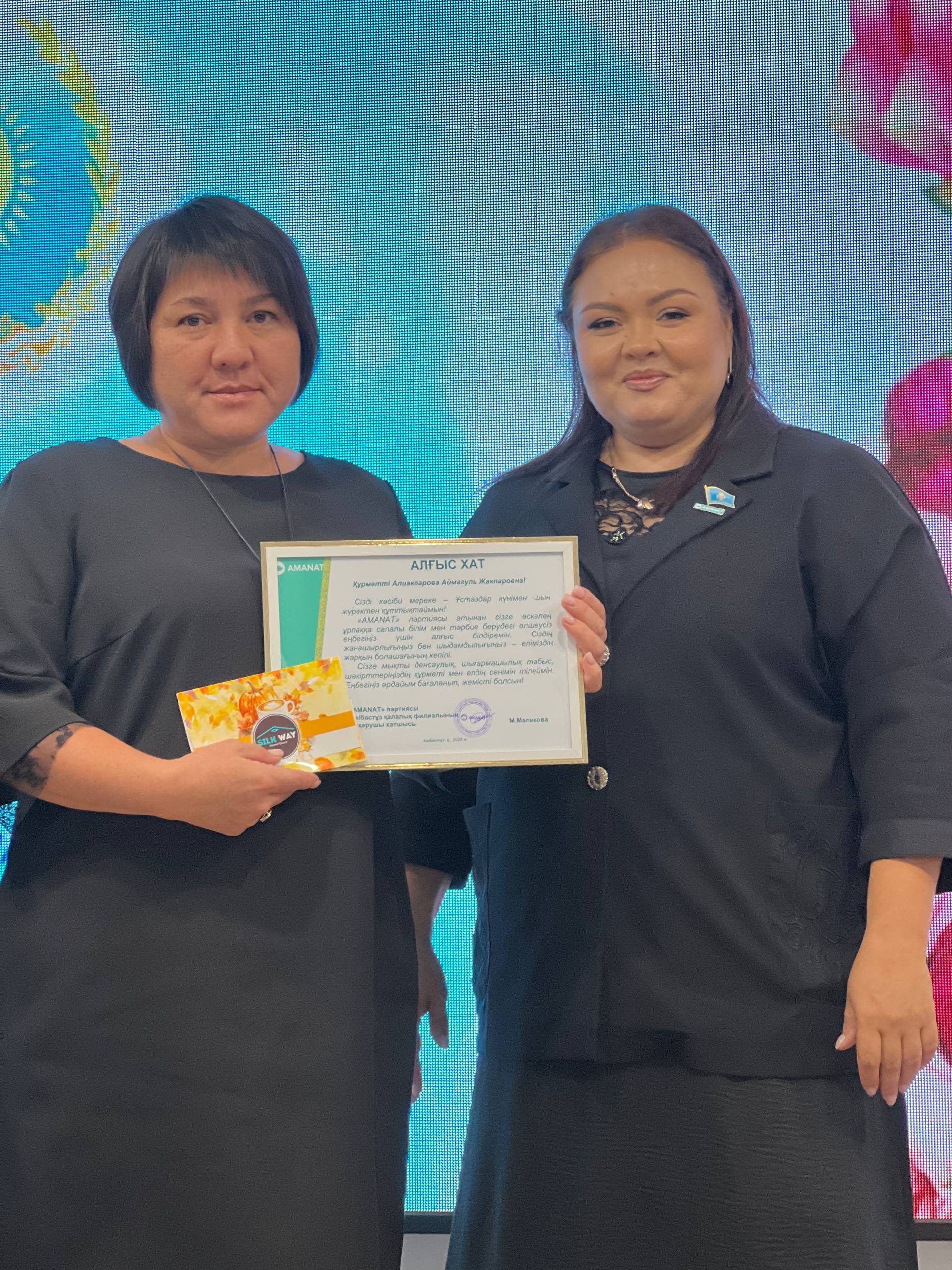 — Дорогие педагоги, сегодня хочется выразить вам огромную благодарность за ваш труд. Вы действительно движущая сила не только нашей партии, но и страны в целом. Потому что от вас зависит будущее поколений, от ваших знаний, профессионализма и труда зависит то, каким будет Казахстан завтра. Для нас очень ценно, что сегодня вы среди нас. Спасибо вам большое! Мы хотели не просто наградить вас грамотами и благодарственными письмами, но и вручить сертификаты в качестве подарков. Эти сертификаты были приобретены при поддержке генерального директора ТОО «Энергоуправление» — Гайнулина Рустама Мухамадуллаевича, — отметила Мариям Маликова, исполнительный секретарь ЭГФ партии «AMANAТ».