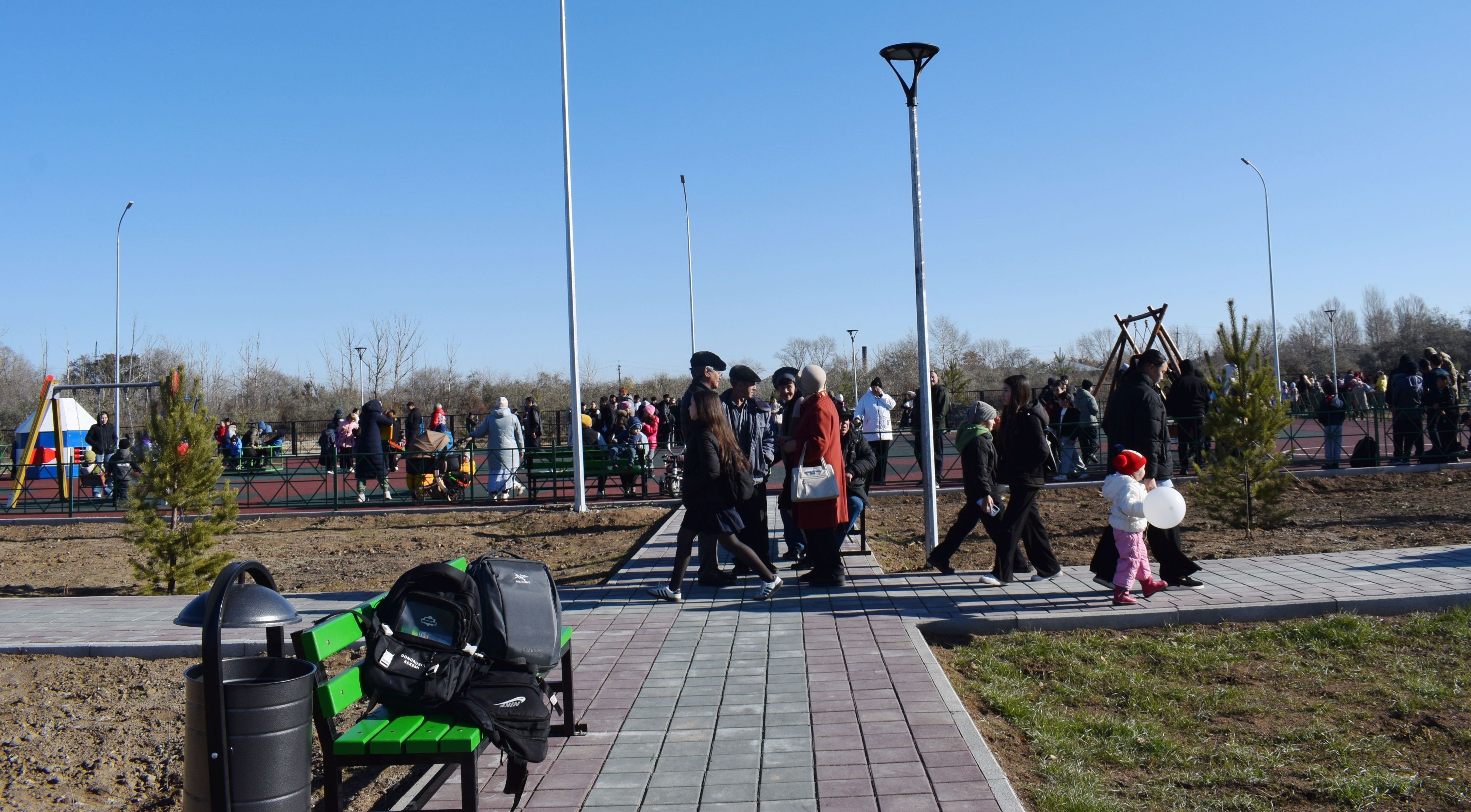 В парке культуры и отдыха, помимо дорожек, высаженных деревьев и установленных лавочек, предусмотрели несколько тематических зон. В первую очередь, это большая сцена, где могут проходить концерты и массовые мероприятия. Есть детская и спортивная площадки, теннисно-волейбольное поле и зона для шахмат и национальных игр. Зеленое оформление тоже нетривиальное — на территории парка высажено 150 елей, поэтому зелено здесь будет в любое время года.