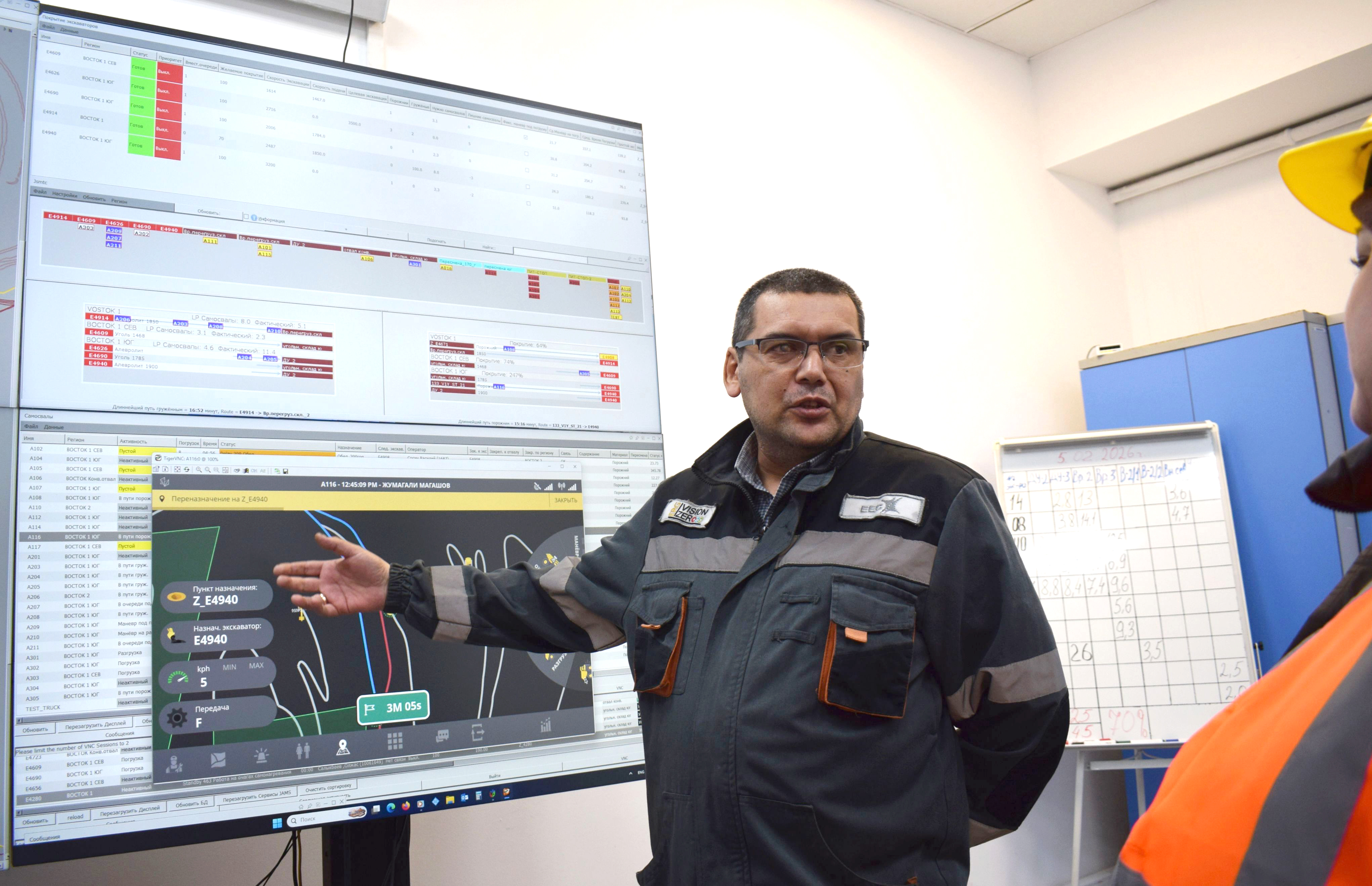 — С 2023 года у нас работает автоматизированная система управления производственными процессами. Сейчас она модернизирована. В диспетчерской два компьютера и восемь мониторов, на которых отображается работа карьера в режиме онлайн. Каждый экскаватор оснащён планшетом, на самосвалах установлены камеры. Мы видим перемещение техники, объёмы перевозок, расход топлива, износ шин. Все параметры учитываются автоматически, — рассказал начальник производственной службы Евгений Валеахметов.