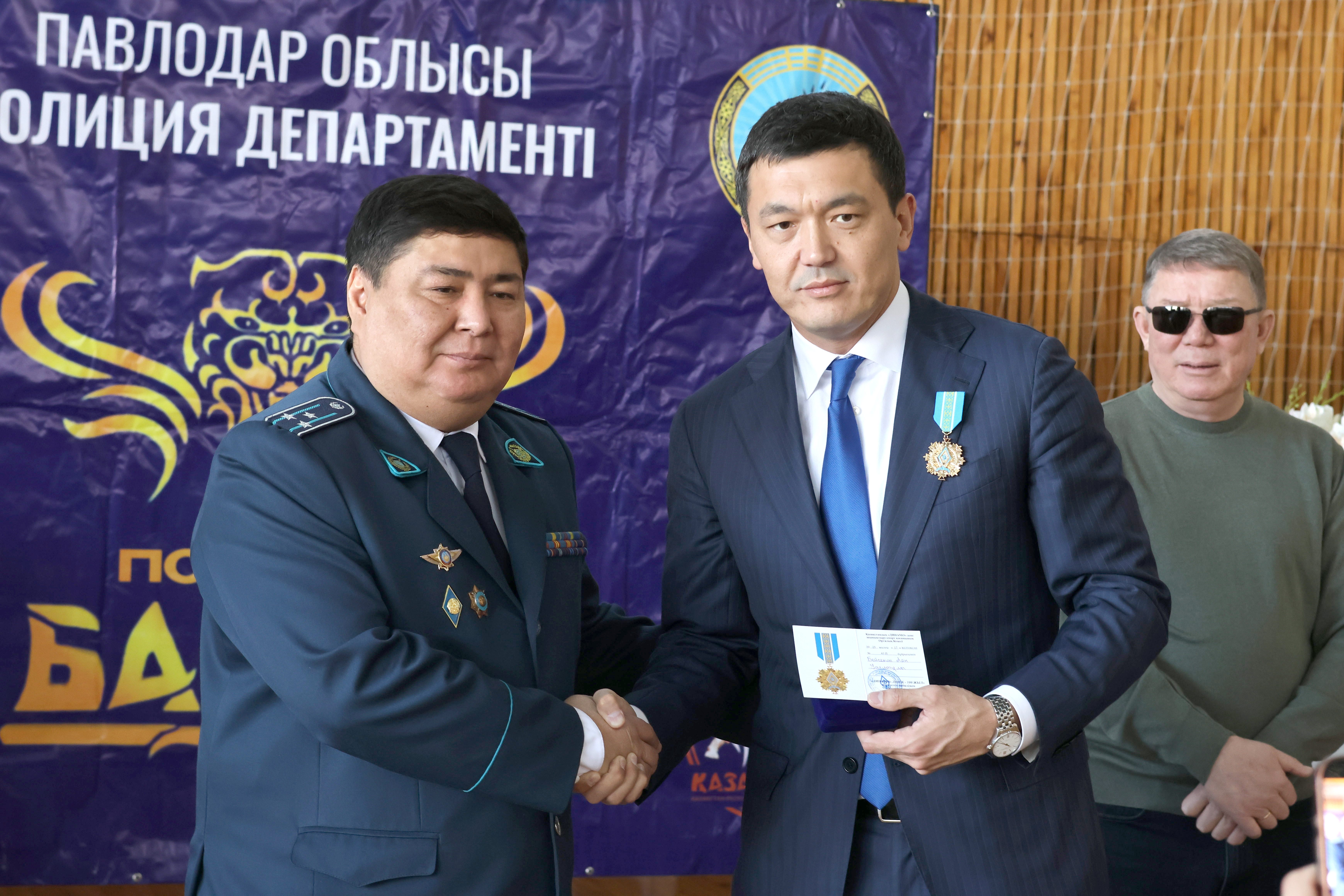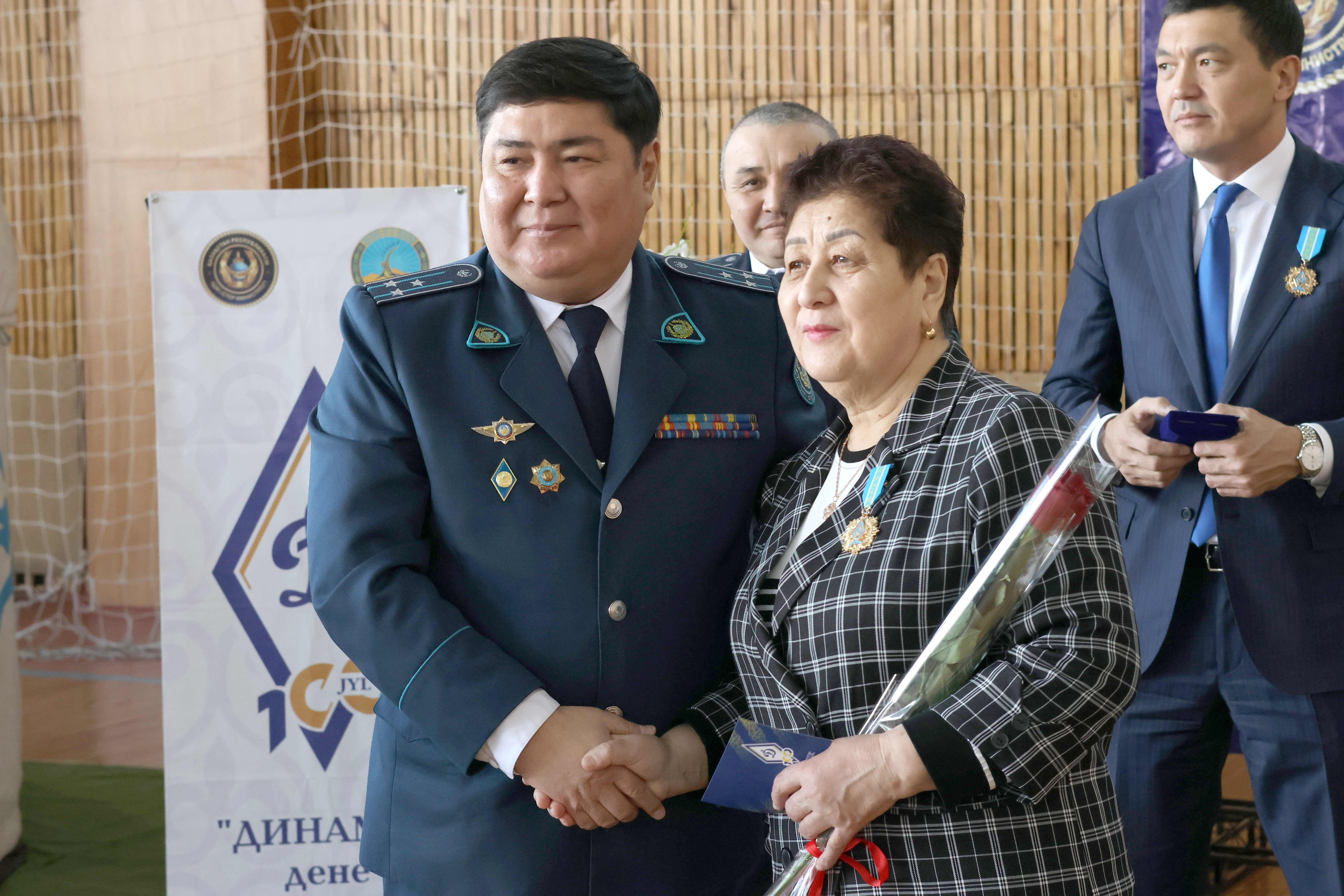 Торжественная часть продолжилась чествованием тех, кто посвятил жизнь развитию спорта и укреплению правопорядка. Заместитель начальника Департамента полиции Павлодарской области Жандос Орынбаев вручил нагрудные знаки, приуроченные к столетию основания Общества физической культуры и спорта «Динамо», особо отличившимся экибастузцам.